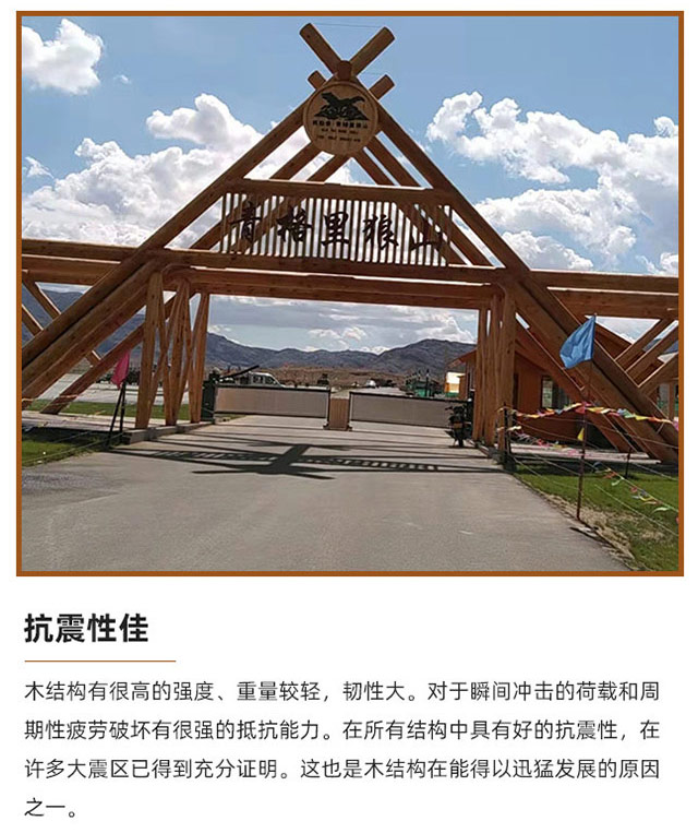 • 木結(jié)構(gòu)有很高的強(qiáng)度、重量較輕,韌性大。對(duì)于瞬間沖擊的荷載和周 期性疲勞破壞有很強(qiáng)的抵抗能力。在所有結(jié)構(gòu)中具有好的抗震性,在 許多大震區(qū)已得到充分證明。這也是木結(jié)構(gòu)在能得以迅猛發(fā)展的原因 之一。